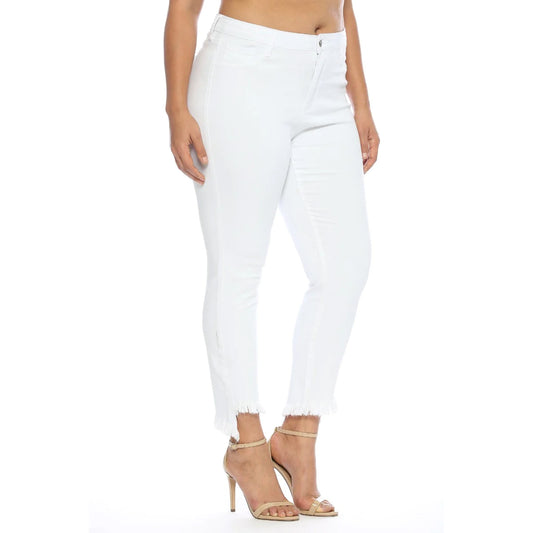 Mid Rise Crop Skinny Jeans with Frey Hem - White