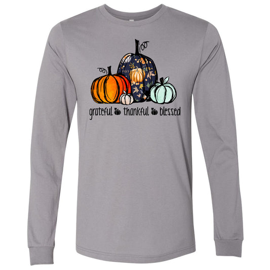 Grateful Thankful Blessed Patterned Pumpkin - Storm Tee
