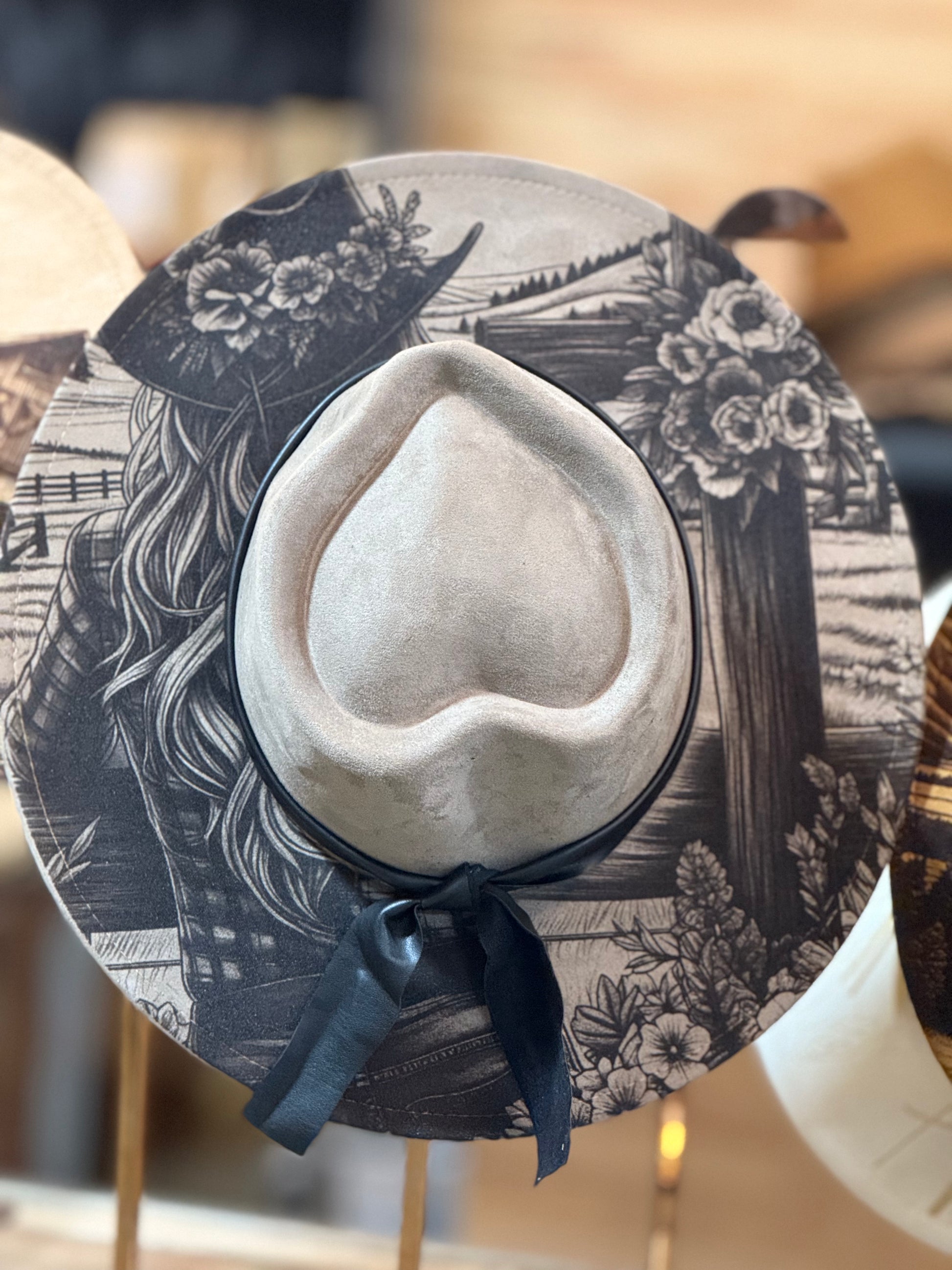 Cowgirl Cross Cowgirl Hat Laser Burned, Wide Brim Faux Suede Hat, EB628 Color shown Brown. Adjustable band 22.6-22.8”
