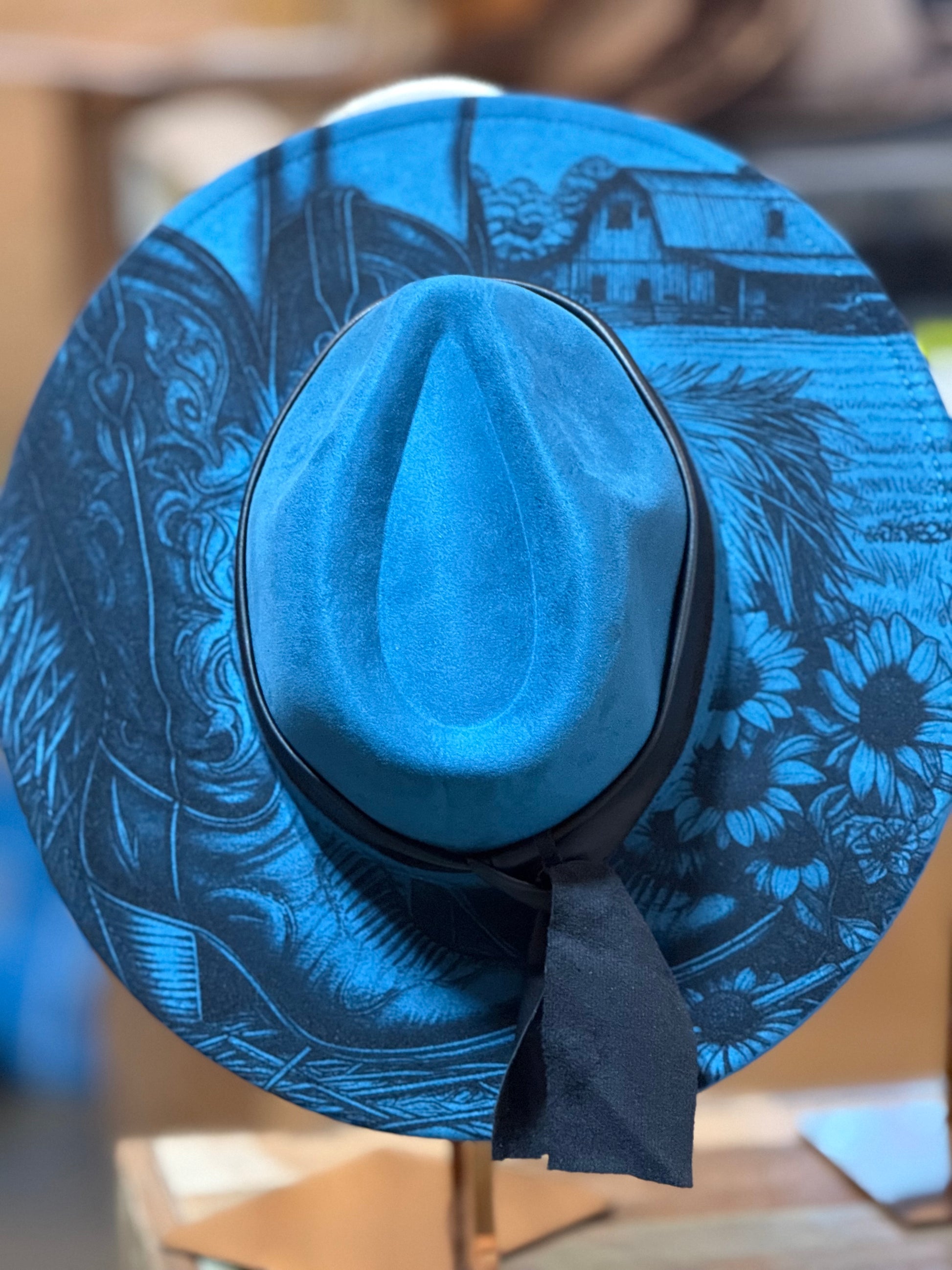 Cowgirl Boots & Sunflowers 4 Hat Burning Design, Western Brim Laser Design, Wide Brim Faux Suede Hat, EB628 Color Dark Teal. Adjustable band 22.6-22.8”