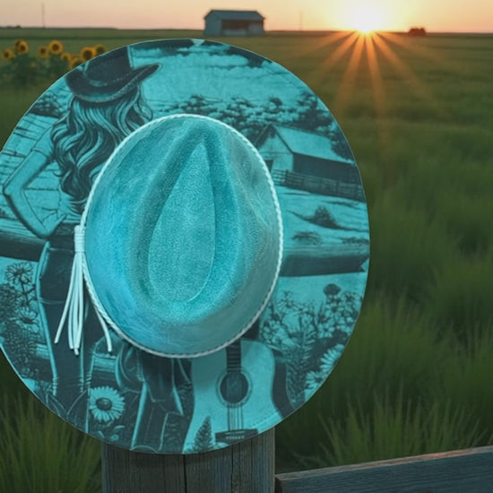 Turn heads and stir hearts with the Backroads Muse—a turquoise cowboy hat that blends rustic soul with artistic precision. Crafted for dreamers, musicians, and trailblazers, this statement piece features a laser-etched brim showcasing a soulful Western scene: a long-haired woman in a cowboy hat stands beside a barn and guitar, framed by sunflowers, trees, and fence lines that echo the rhythm of rural life.
