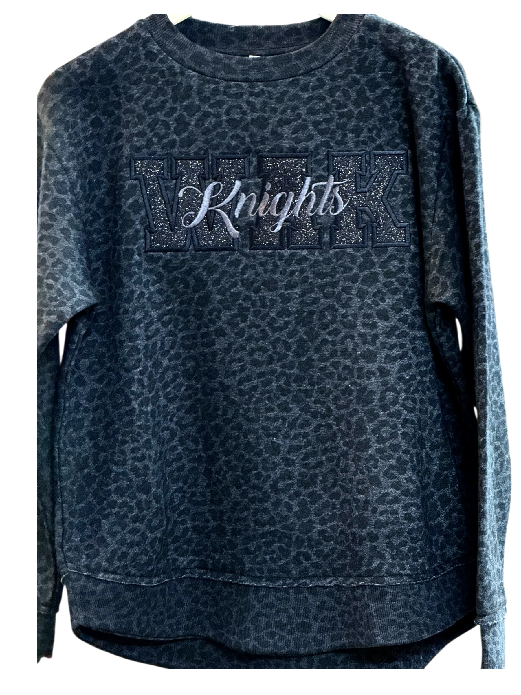 Windsor - Women’s Weekend Fleece Crewneck Sweatshirt with WAK Knights Glitter Appliqué - Black Leopard (3525)